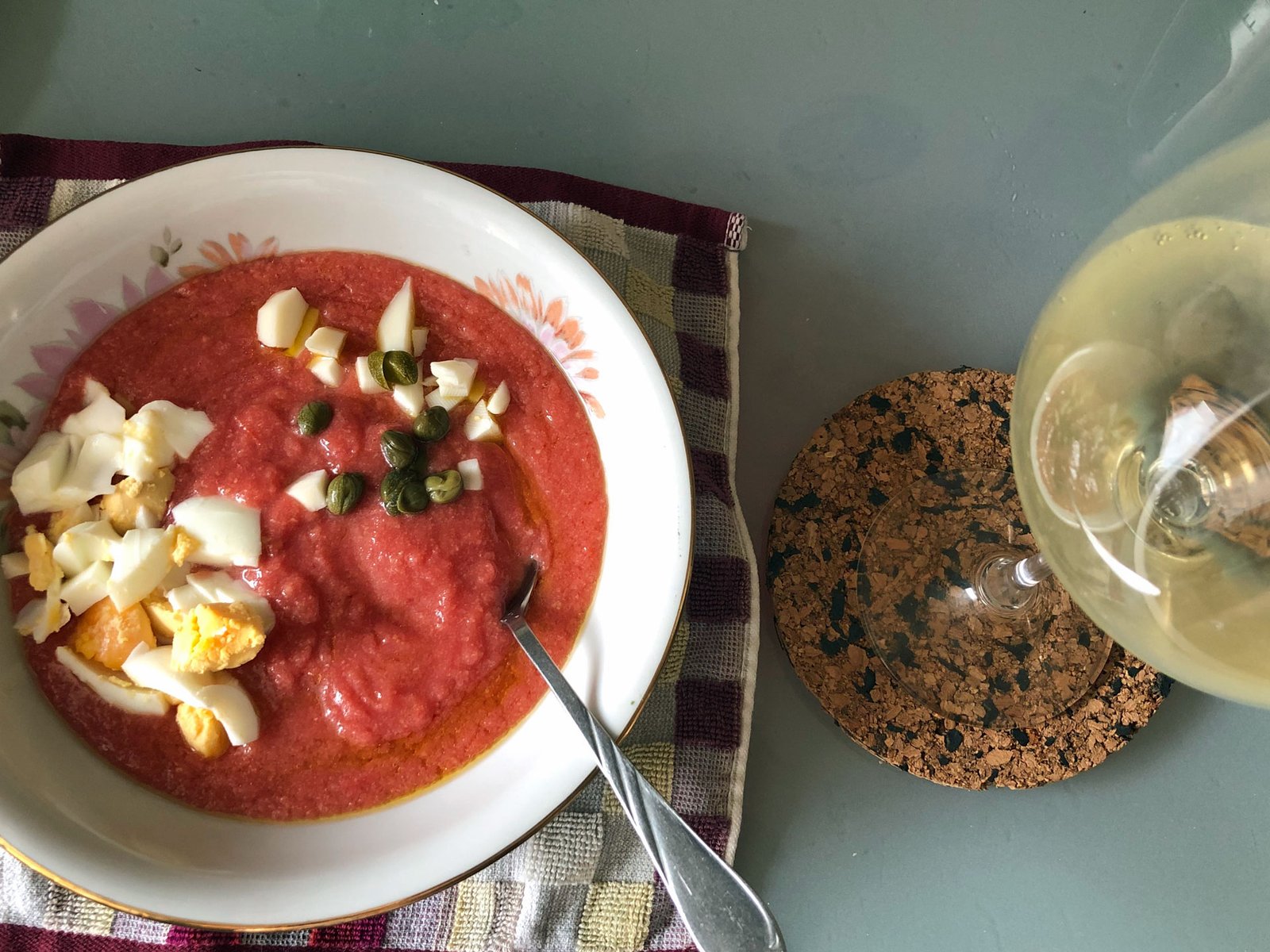 Нужно взять несколько помидоров и пару зубчиков чеснока и взбить в блендере или другом кухонном приспособлении до состояния пюре. Добавить кусочки белого хлеба — дать им намокнуть и ещё раз всю эту смесь размешать. Добавить соль по вкусу и немного оливкового масла. Консистенция должна получиться более густой и кремозной, чем у гаспачо.