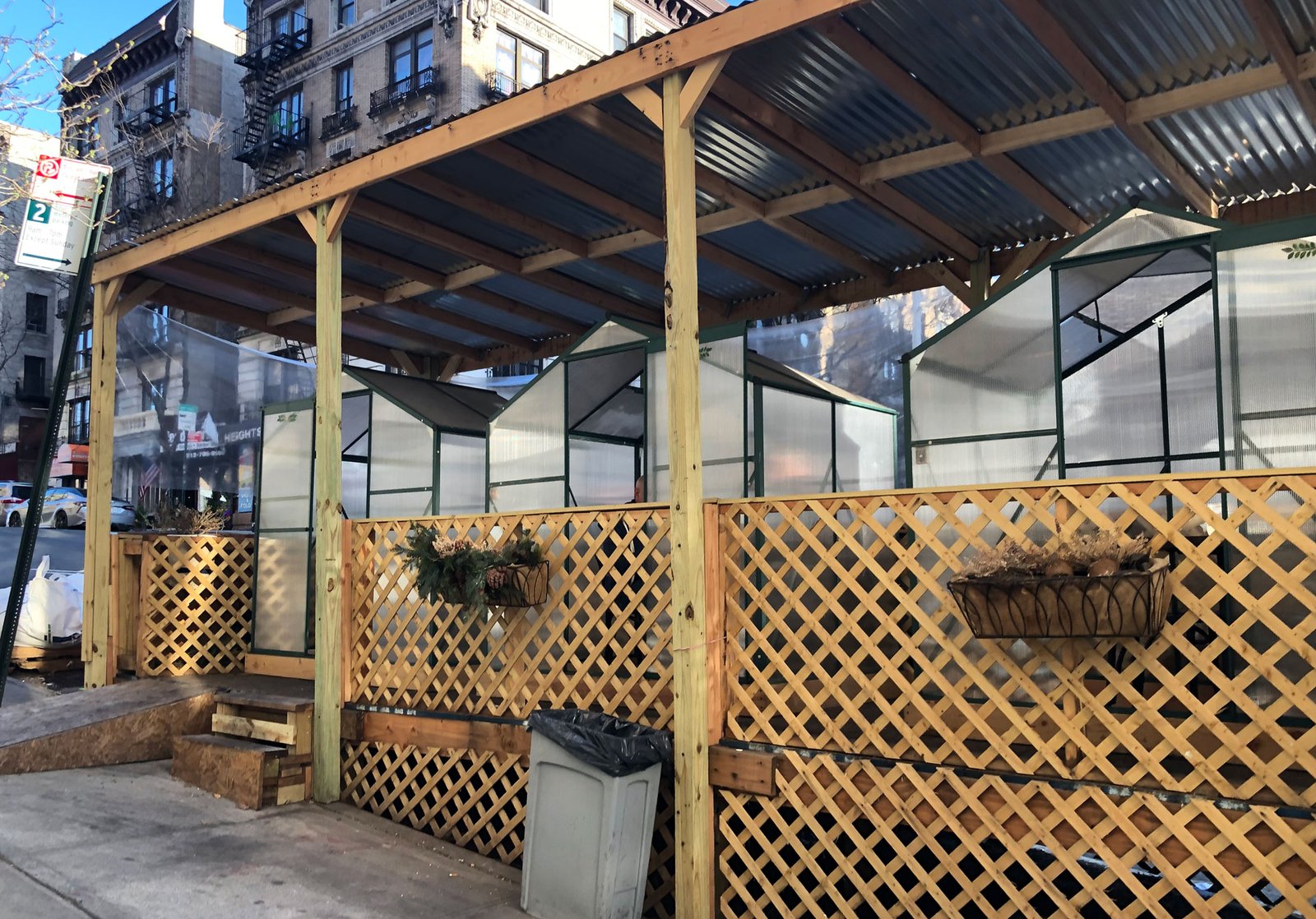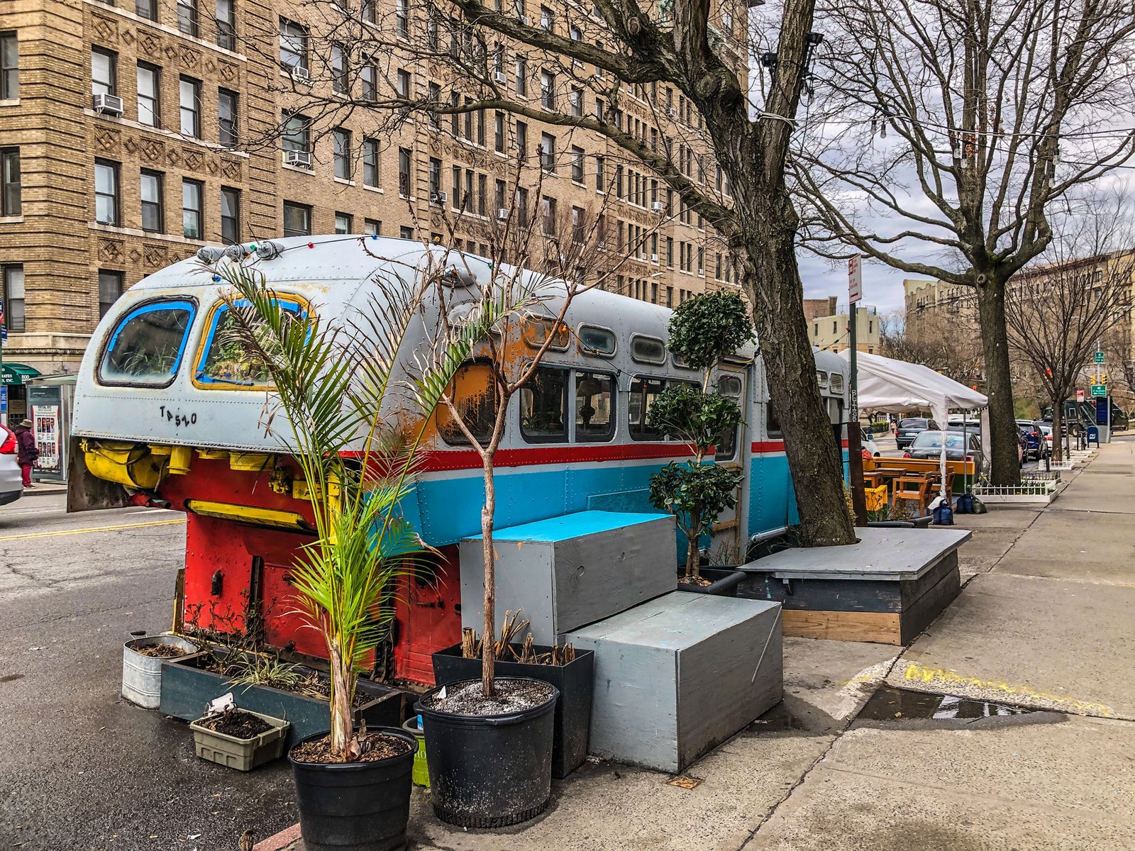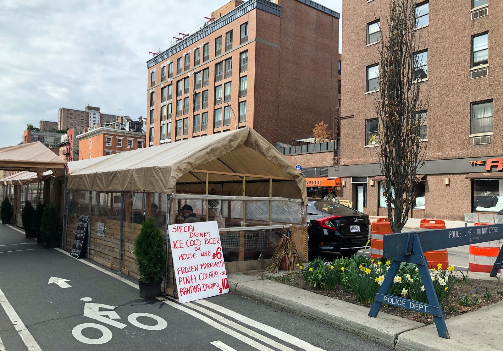 По всем улицам, где есть рестораны, появились — ещё зимой — вот такие террасы типа домиков для голодных горожан, которые соскучились по общепиту за период локдауна. Внутри ресторанов пока есть большие ограничения на количество мест, которые можно занимать.