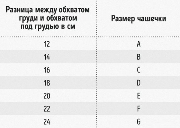 Чтобы понять эти чуждые нам буквы, определяющие размер чашек, и по достоинству оценить размер бюста, нужно вычесть из обхвата груди обхват под грудью — измерять лучше портновским метром (швейным сантиметром), а не наощупь.