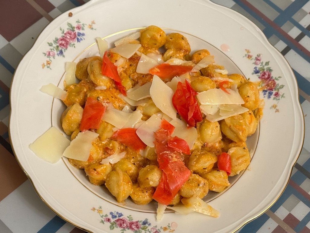 Хорошо всё размешиваем и накладываем в тарелки. Сверху можно посыпать кусочками пармезана и маринованного имбиря из Перекрёстка.