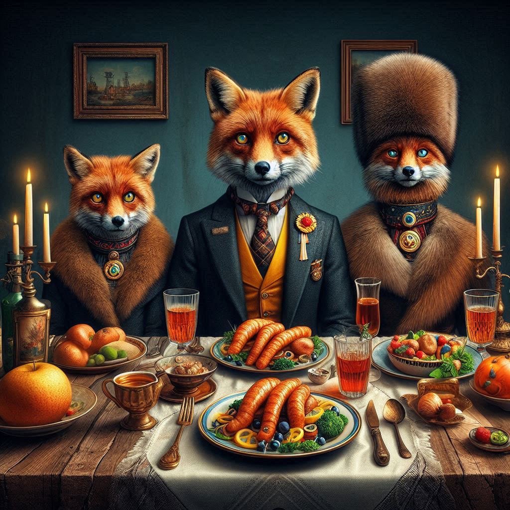 Сегодня, например, у нас на обед были пельмени. Всей семьёй мы месили и раскатывали тесто, лепили пельмешки с начинкой из мяса индейки. Индейку сами вырастили на балконе и сами убивали её в ванной — чтоб легче было кровь смывать.