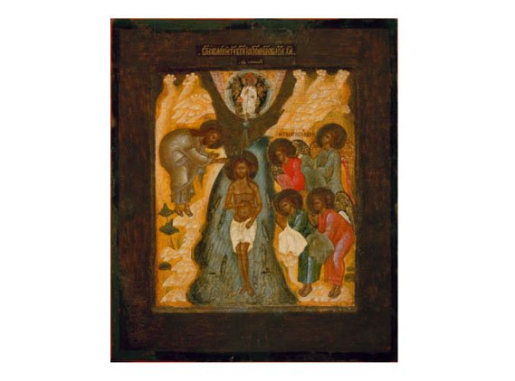 Иконография иконы в целом традиционна и следует образцам, сложившимся еще в ранней Византии. Христос стоит в водах Иордана, к Нему…
