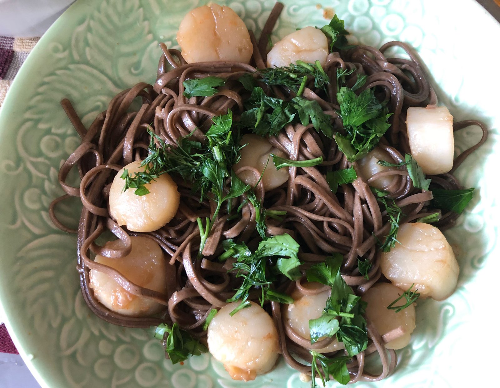 По случаю Международного рыбного дня приготовил блюдо из морских гребешков с лапшой соба.